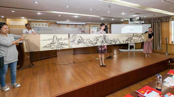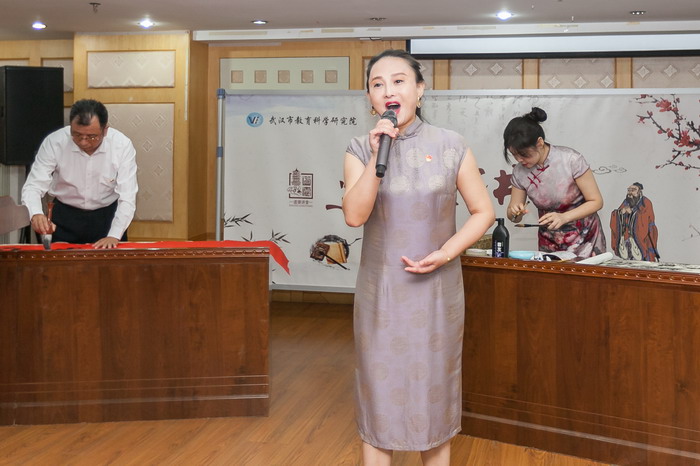 本次活动由体卫艺教研室承办,小学音乐教研员胡晓燕和美术教研员蔡颖莹两位老师共同主持。活动分为六个议程。第一项,中学音乐教研员李克玲深情演唱祝福曲《爱我中华》。歌声中,院第五党支部书记、体卫艺教研室主任杨明春现场挥毫泼墨,展示书法魅力;蔡颖莹老师现场创作山水画,妙手丹青,出神入化。全体教科院人纷纷书写“福”字卡后,齐声喊出了自己的心声“爱我中华”,掀起了向祖国送祝福的热潮。