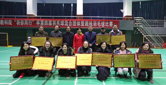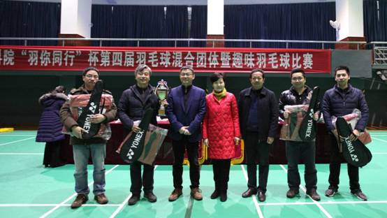 一拍既出,谁羽争锋!为进一步推进教职工“健康行动计划”,喜迎军运会,我院“羽你同行”杯第四届羽毛球混合团体暨趣味羽毛球比赛于12月27日在市十一中学圆满落下帷幕。经过近三个月的精心筹备,来自我院8支代表队的百余人次工会会员先后参与了男双、女双、混双和趣味混合赛等项目的激烈角逐。市教育工会主席许芬,我院院长、党委书记李碧武,党委委员、副院长朱长华等领导出席闭幕式并为获奖团队和个人颁奖。闭幕式由党群工作部部长兼工会工作负责人谢琼同志主持。