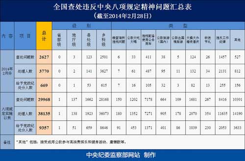 截至2014年2月28日,全国查处违反中央八项规定精神问题29968起,处理38135人,给予党纪政纪处分9357人。查处的问题,主要集中在违反工作纪律、违规配备使用公务用车、大操大办婚丧喜庆、接受或用公款参与高消费娱乐和健身活动、慵懒散等方面。