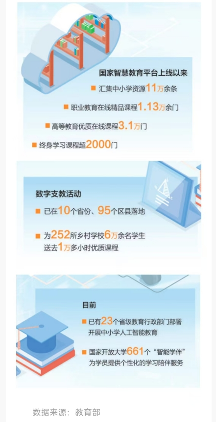 如今,平台已经汇集中小学资源11万余条,职业教育在线精品课程1.13万余门,高等教育优质在线课程3.1万门,终身学习课程超2000门。数字支教活动已在10个省份、95个区县落地,为252所乡村学校6万余名学生送去1万多小时优质课程。