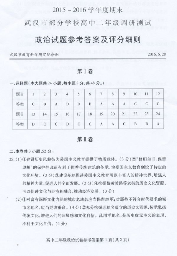 2015-2016学年度期末武汉市部分学校高中二年级调研测试政治试题参考答案及评分细则