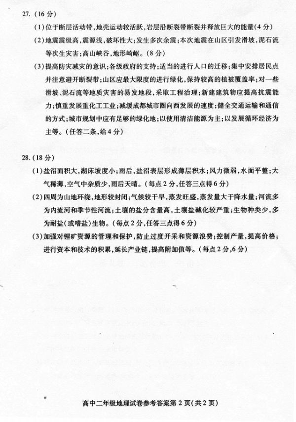 2015-2016学年度期末武汉市部分学校高中二年级调研测试地理试题参考答案及评分细则