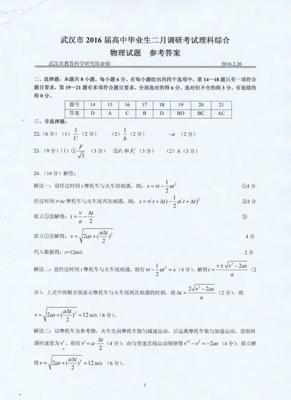武汉市2016届高中毕业生二月调研测试理科综合物理试题参考答案及评分细则