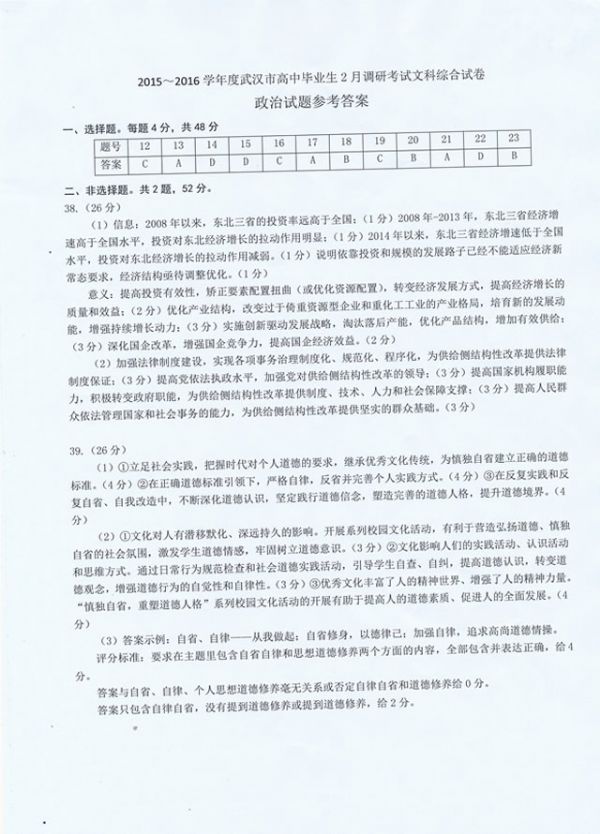 下一条:武汉市2016届高中毕业生二月调研测试文科综合历史试题参考答案及评分细则