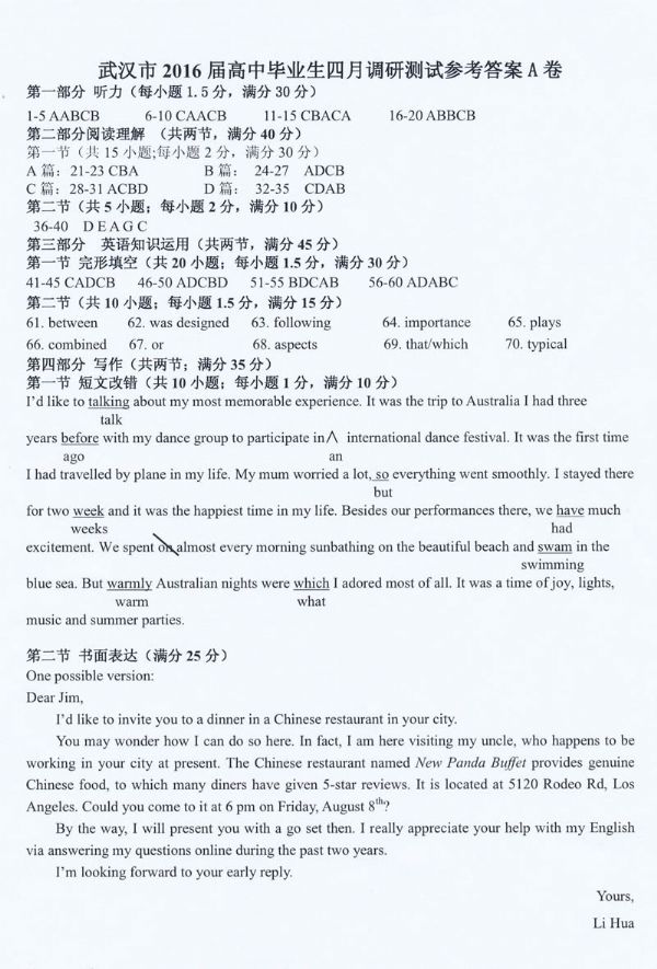 武汉市2016届高中毕业生四月调研测试英语试题参考答案及评分细则