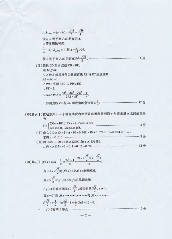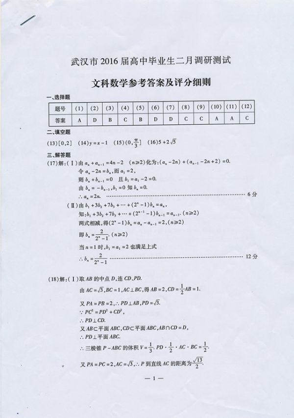 武汉市2016届高中毕业生二月调研测试文科数学参考答案及评分细则
