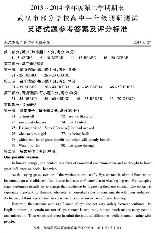 下一条:2013-2014学年度第二学期期末武汉市部分学校高中二年级调研测试英语试题参考答案及平分细则