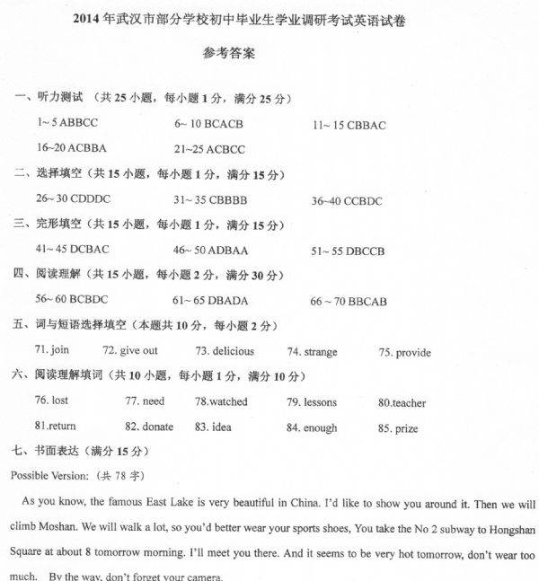 九年级四月调考英语答案