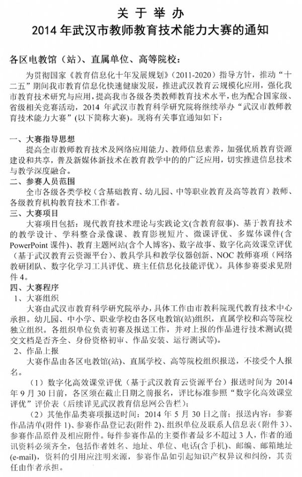 下一条:关于开展“2014年武汉市中小学信息技术学科‘四优’(优质课)评比”的通知