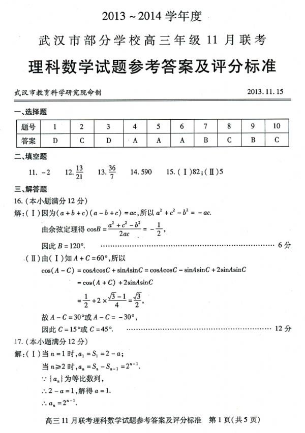 下一条:2013~2014学年度武汉市部分学校高三年级11月联考文科数学试题参考答案及评分细则