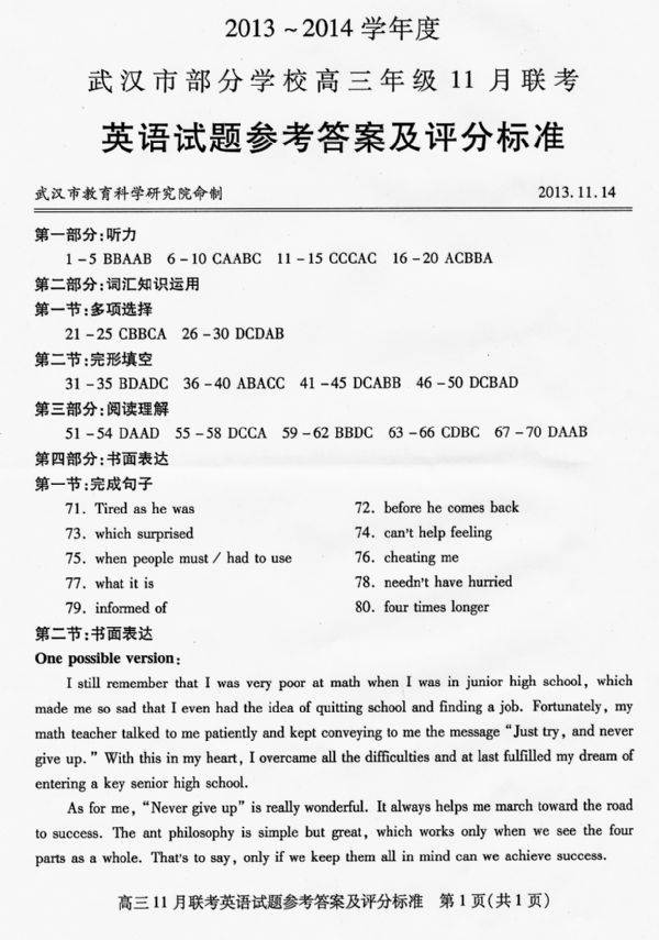 下一条:2013~2014学年度武汉市部分学校高三年级11月联考理科数学试题参考答案及评分细则