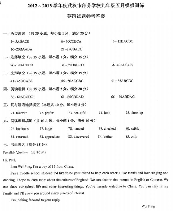 下一条:2012-2013学年度武汉市部分学校九年级五月模拟训练化学参考答案及评分细则