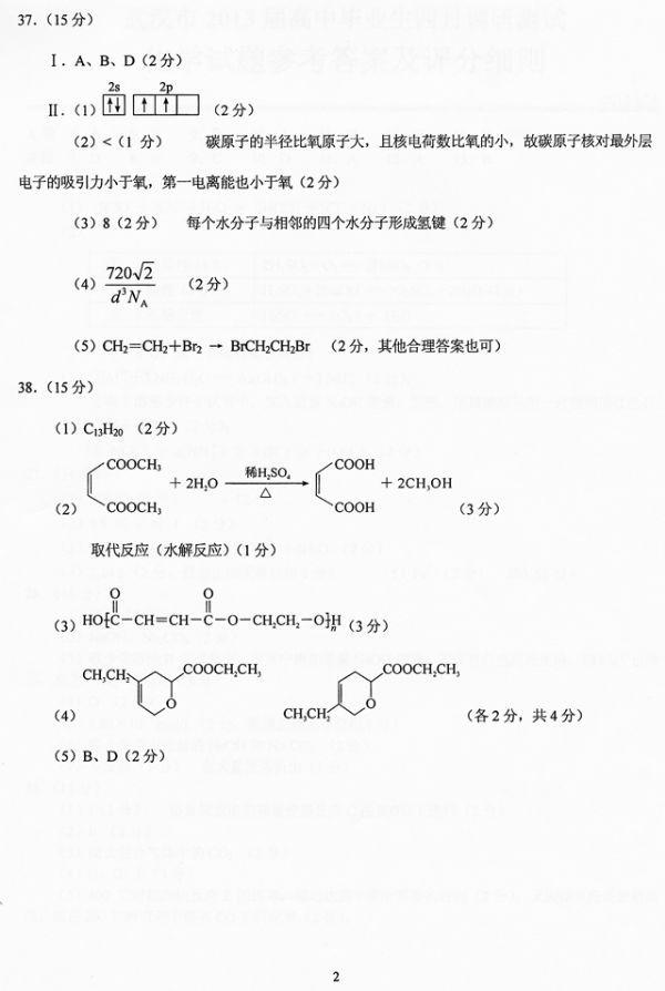 武汉市2013届高中毕业生四月调研测试理科综合化学试题参考答案及评分细则