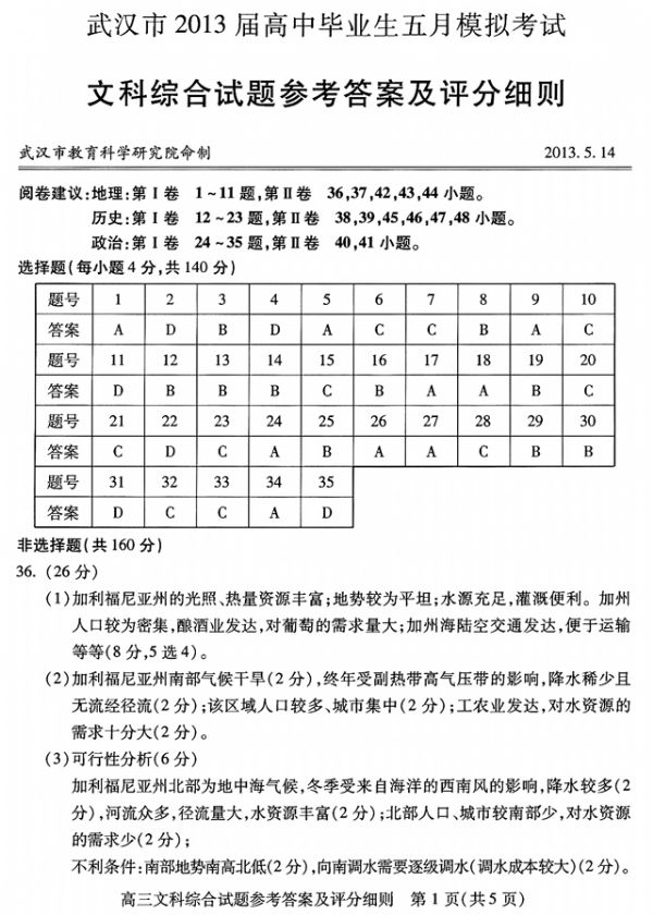 武汉市2013届高中毕业生五月模拟考试文科综合参考答案及评分细则