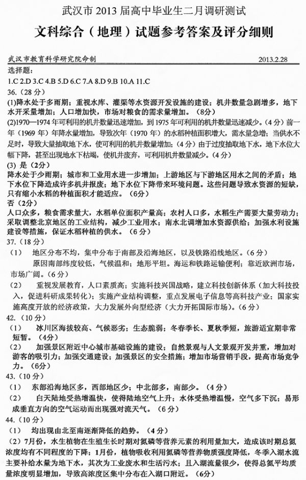 2013年2月高三地理调考答案