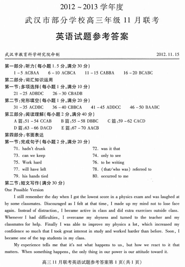 2012--2013学年度武汉市部分学校高三年级11月联考英语参考答案