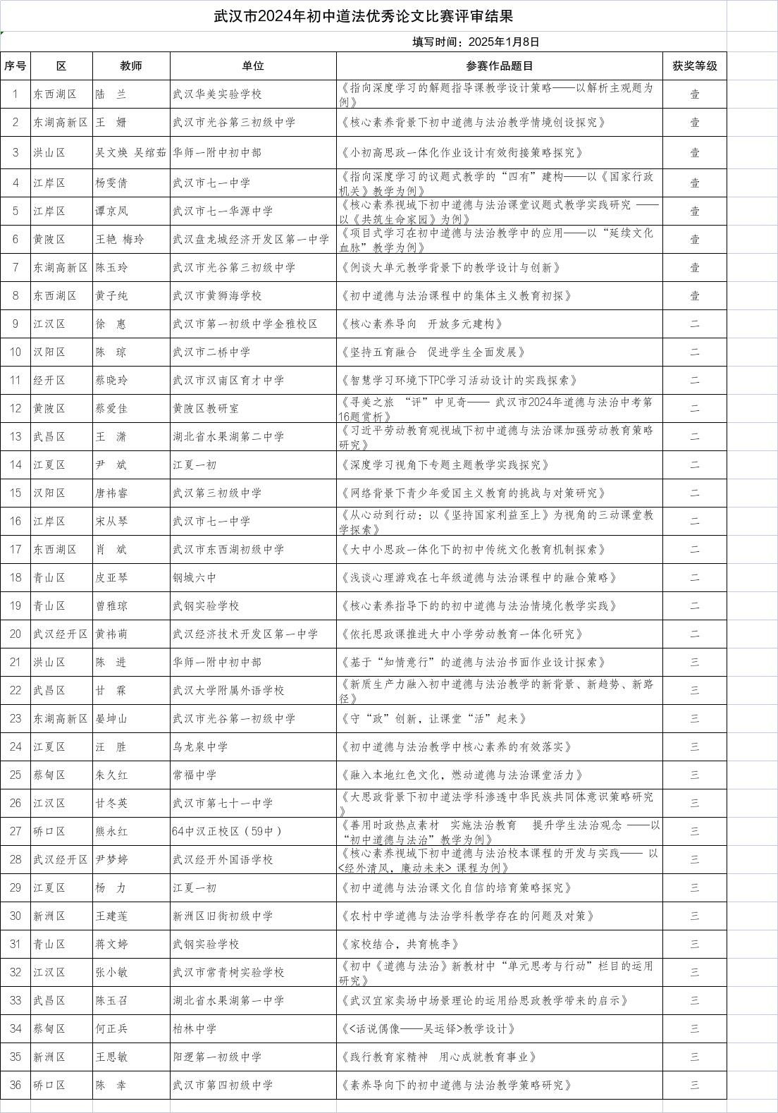 武汉市2024年初中道法优秀论文比赛评审结果公示