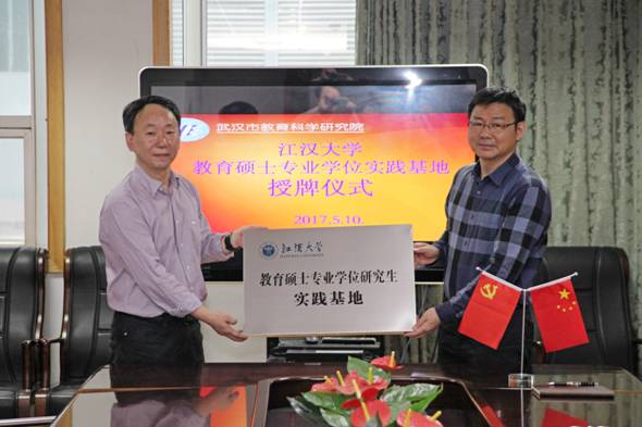2017年5月9日上午,江汉大学教育硕士专业学位实践基地授牌仪式在我院举行,标志着我院正式成为江汉大学教育硕士专业学位实践基地。江汉大学教育学院孔晓东院长来院授牌。我院党委副书记、纪委书记李碧武,党委委员、副院长朱长华,院工会主席杨晓文,以及院办公室主任杨明春,院办公室副主任谢琼、傅军出席了授牌仪式。
