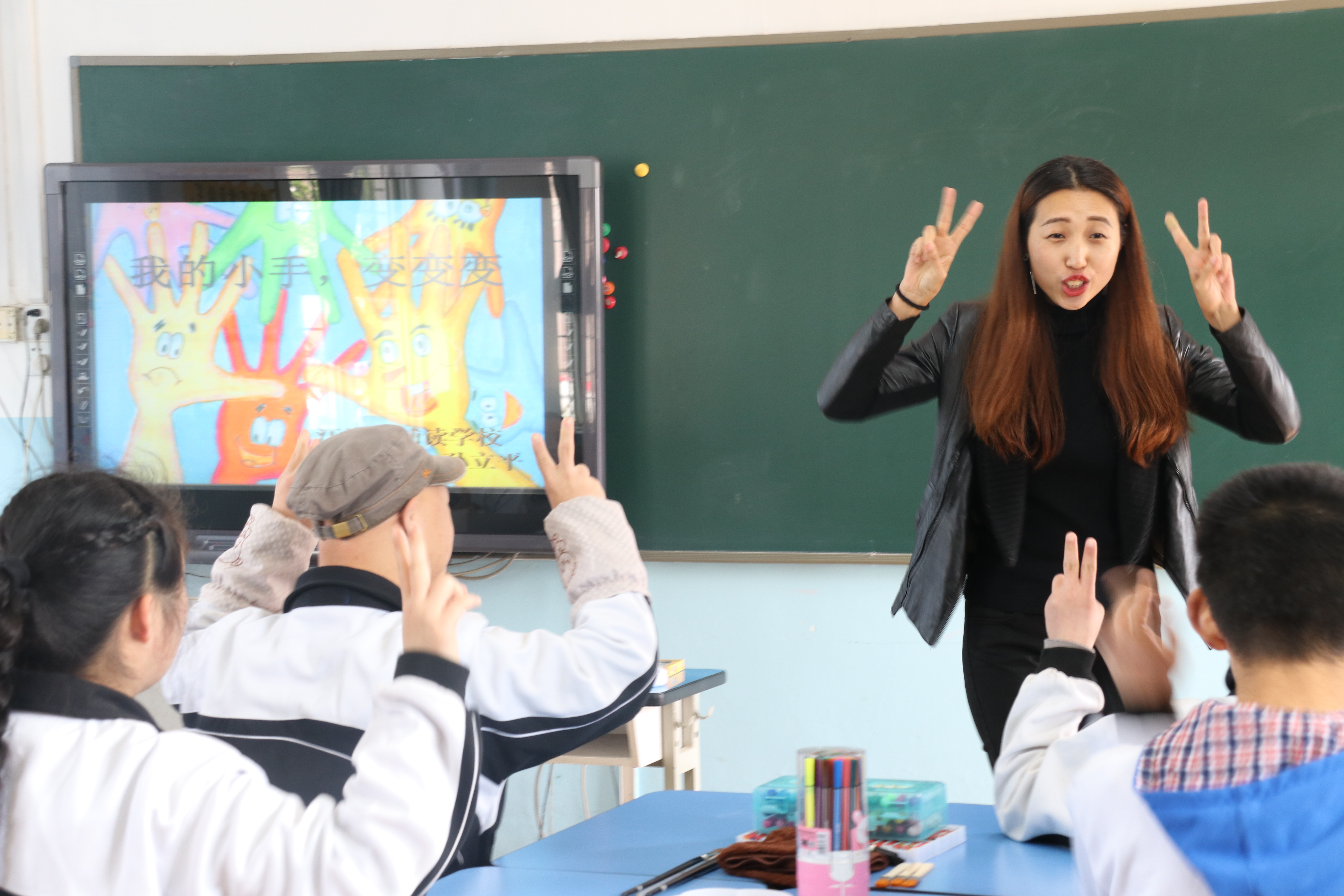 美术课《我的小手变变变》中,教师用直观、形象、生动的小手变蝴蝶、孔雀、蜗牛等引起智障生的注意,引发兴趣来揭示课题培养视觉感知力,让学生发现美,感知美。通过课件展示彩影螃蟹、天鹅等让学生找画中的小手在哪里,特别是抓住细节指导小手变公鸡,让学生感受美,帮助他们形成积极探索的良好品质。用小手变一变进行创作让学生体验手和表现手的美,培养学生的审美能力。另外,在赏环节中,让学生说出自己的作品美在哪里,为什么?让学生自由表达情感,尝试表现个性与创意,教师在点评中用亲切、温婉的语言,给予学生激励在学习中感到愉悦!这节课教师抓住了手的变化,采用主题鲜明、色彩丰富、委婉音乐造气氛的多媒体与手肢体语言并用方法教学,激发智障生对小手变的兴趣,让8位学生掌握了手掌作画的技巧。