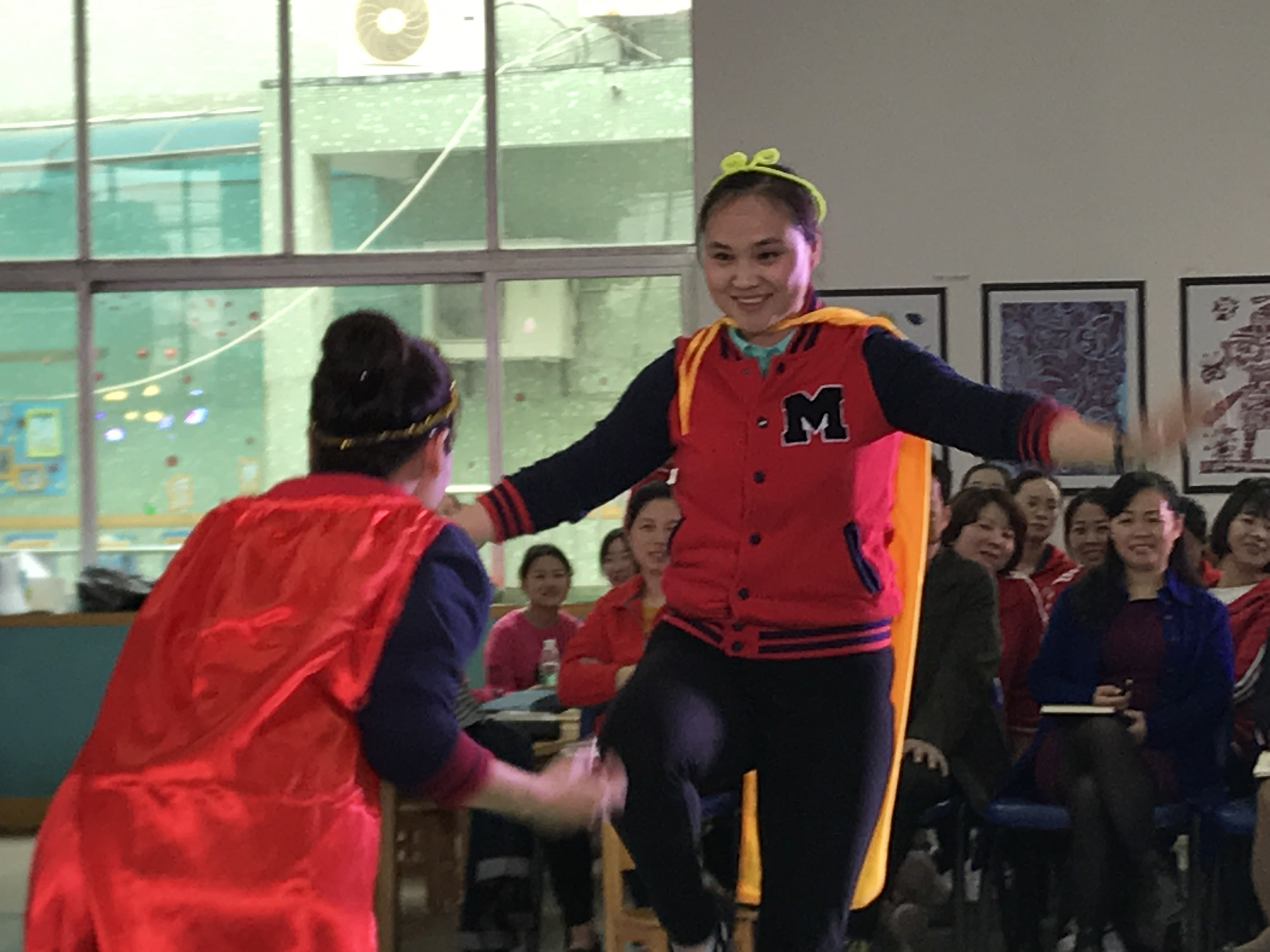 第三个环节:缤纷的研讨。 重头戏,由省直一幼牵头的武昌区项目联盟养成教育一组进行了教研活动现场展示开始了。 首先播放了养成同盟一组制作的微视频《润物无声促养成,齐思共研育“自主”》的养成教育教研活动近三年的足迹回顾,进行了“体验式学习与幼儿习惯养成实践研究”为主题的一系列教研活动,促进了四所联盟园在养成教育方面的整体提升。 之后,来自大东门幼儿园、华大凯乐幼儿园、爱弥儿江南明珠幼儿园和省直一幼的70年代,80年代,90年代的老师代表,伴随着各个年代的特色音乐闪亮登场,开始了现场的教研活动。