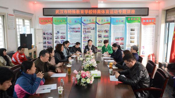 2017年3月7日,在武汉市武昌区培智中心学校进行了一场题为《如何在培智课程标准指导下开展特殊奥林匹克体育运动》的专题培训。参训的主要领导有武汉市专委会文洁理事长、学术委员会顾问齐玲老师、常务理事武昌区培智中心学校王霞校长、常务理事江夏区特殊教育学校王桂梅校长、江岸区辅读学校吴梅书记、武汉市专委会孟玥秘书长、副秘书长张晓雯,以及武汉市各特教学校的分管领导和体育骨干教师。