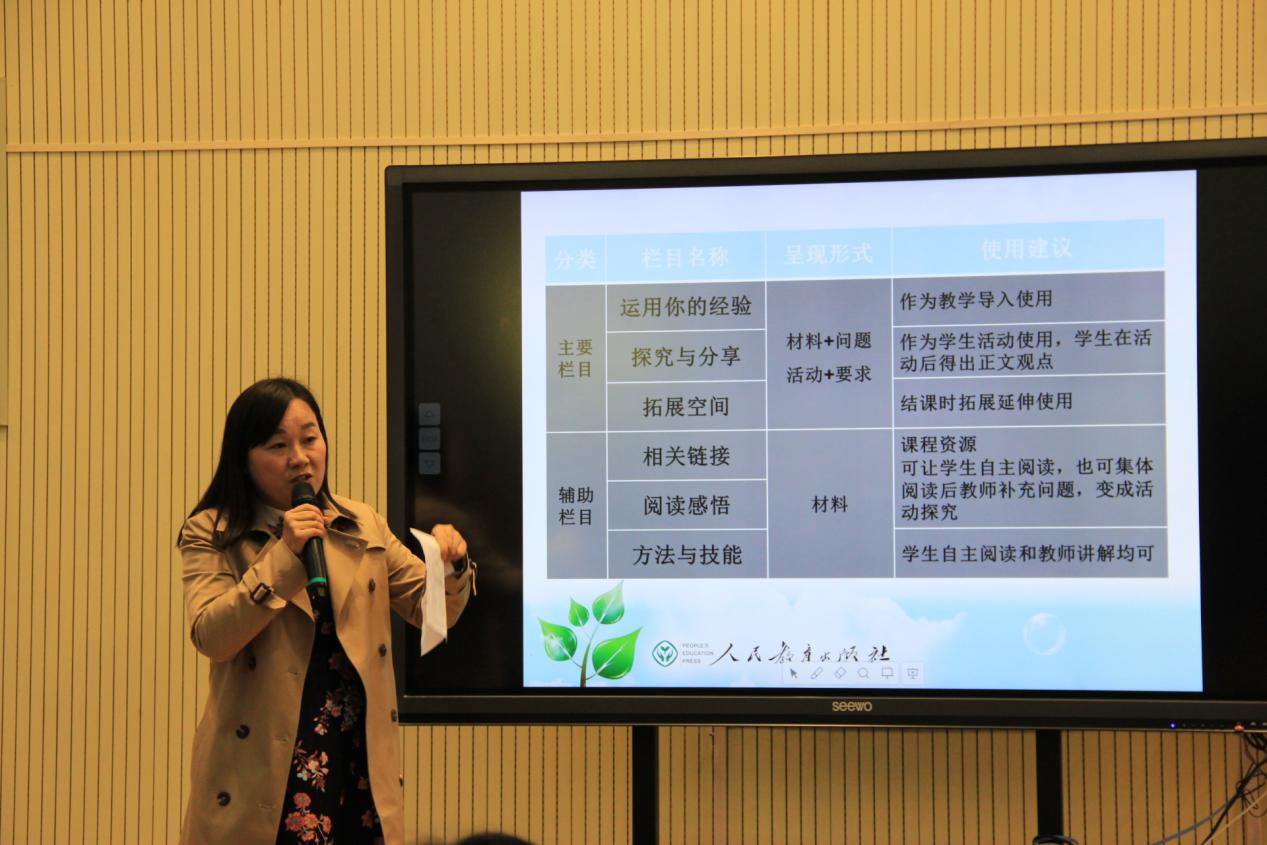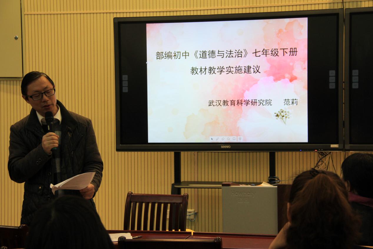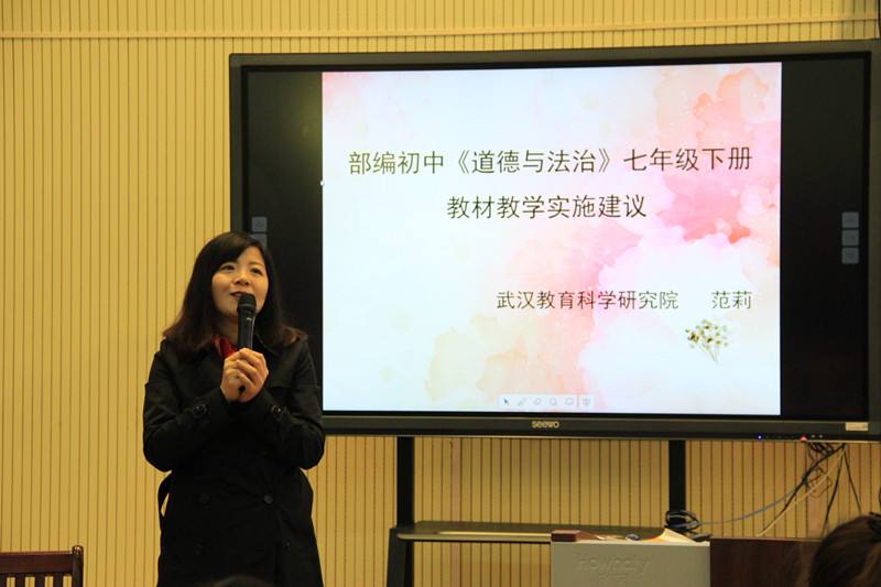 活动最后,赢乐lV政治教研员范莉老师给与会老师作了新教材教学实施建议的报告。以《道德与法治》七年级下册为例,与会老师受益匪浅。范老师指出,在新教材教学中,要从教材文本走向学生真实生活,要从教材内容走向教学内容,要从完成教学任务走向学生问题解决;她鼓励大家抓住新教材推出的机遇,迎接好这个挑战,不断学习,善于学习,努力成长为优秀的学科教师。