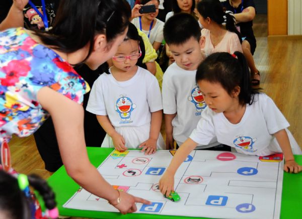 三是游戏化、情境化教学让幼儿可感可知。《3~6岁儿童学习与发展指南》(以下简称《指南》)指出:幼儿的社会性主要是在日常生活和游戏中通过观察和模仿潜移默化地发展起来的。集体教学中的游戏化,更能激发幼儿的兴趣,调动幼儿的情绪情感,从而提升幼儿的能力。32位选手的现场教学活动中,几乎都设置了游戏环节,有些活动更是以游戏贯穿始终,竞技、益智、娱乐、亲子、体育、合作等游戏活动的运用,吸引了幼儿,也让活动更加生动有趣。