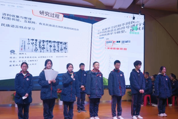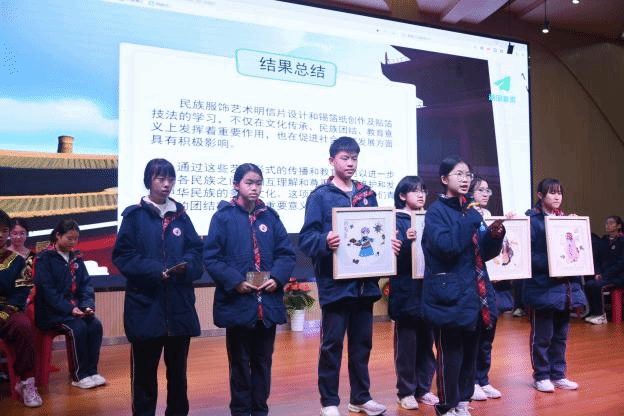 课程以“民族服饰、舞蹈、语言、美食、建筑、音乐”六大主题为载体,引导学生通过跨学科视角探索中华文化的多元魅力。课堂中,数字化技术的应用成为一大亮点。以“如何用艺术与科技促进民族团结”为核心驱动问题,引导学生经历“选题规划—实践探究—成果展示—反思迭代”的完整项目周期。学生通过团队协作完成民族艺术电子手册、多民族融合歌舞展演等成果,在解决真实问题的过程中锻炼了批判性思维、创新能力与数字化素养。