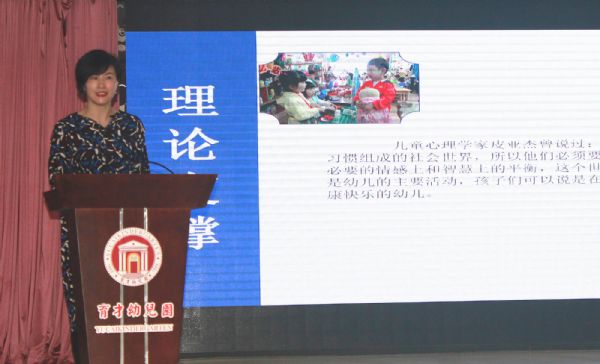 首先,区域环境经验交流。育才幼儿园保教园长杜宇以《提升学习品质,守护本真童年》为题,分享交流了在《指南》引领下的育才幼儿园区域游戏研究经验。育才幼儿园有着十多年区域研究历程,从最初的园本向科研课题研究转变。先后承接多个省市级区域研究课题,总结出大量经验和成果与大家分享。从区域的环境设置、材料投放、教师的角色定位到幼儿观察指导,从幼儿学习方式到课程模式的改变。无一不透露出育才幼儿园始终坚持以“回归儿童天性,顺应和促进儿童的发展”为己任。