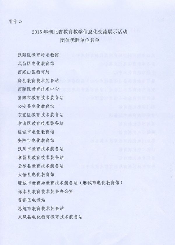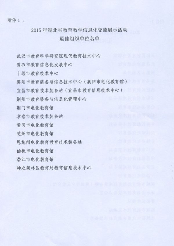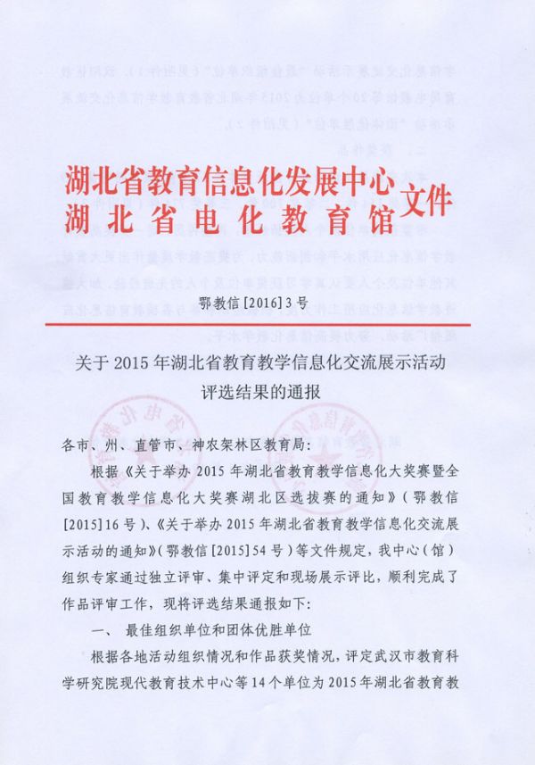 在由湖北省教育厅教育信息化发展中心(湖北省电教馆)举办的“2015年湖北省教育教学信息化交流展示活动”中,我市教师取得优异成绩,创造新的纪录:武汉市在全省16个市州的2000余件作品中独占鳌头,81件作品入围现场决赛,经过现场比赛紧张角逐,最终56件作品荣获特等奖(湖北省共149件作品获特等奖,占全省的37.6%),另有200多件作品获得一、二、三等奖。武汉赢乐lV现代教育技术中心被评为“最佳组织单位”,汉阳区电教馆、武昌区电教馆在全省区县级单位中荣获“团体优胜奖”。市教育局孟局长对武汉市取得成绩给予了肯定,专门作出批示:“再接再厉,抓好深化”。
