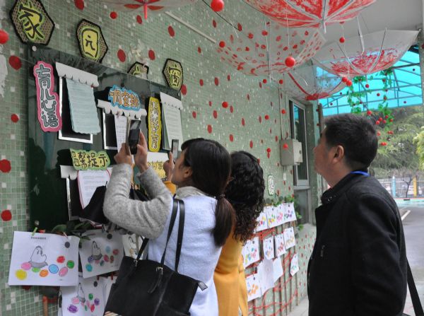 最后,在一幼园长的带领下,代表团的专家和园长们参观了园内的环境。富有一幼特色的个性化的LOGO标识和视觉识别系统的运用,主色调自然和谐,总平面图、宣传栏、礼仪栏和导视牌等无处不渗透着个性化的文化气息。园长们能感受到园所大环境和班级环境的创设突出以幼儿为本,渗透生态理念,注重色彩、形式、材料、风格等的协调统一。充分利用每层楼走廊、楼梯,巧妙利用三维空间,让楼层有特色,班级有亮点。如:中国风、现代风、农家乐、自然风、海洋风等,同层风格相协调,充分体现了让环境说话、使环境育人的思想。一幼能充分利用得天独厚的自然资源,不断追求在自然的环境、自然的状态下,成就自然的人。在生态的自然环境中启迪幼儿的生活认知,激发对生活的热爱,提升对生活的适应能力;在宽松、愉悦的精神环境中,童真得到充分尊重和展现。一幼个性化的环境文化给大家留下了深刻的印象。