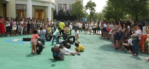 接下来是现场活动观摩环节,幼儿园分别从户外自主游戏、健康教学活动、混龄区角游戏三个方面进行了展示。