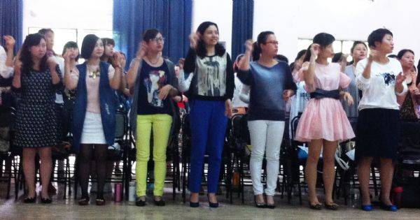 在现场互动环节,武钢幼教中心的教师及洪山区的教师分别针对两节教学活动的设计、实施发表了自己的见解、进行了细致而中肯的点评。其中,洪山区的教师针对声势活动,组织在场所有的教师分成三组,利用绕口令《打醋买布》做了现场的声势卡龙,让我们在场的老师们进一步感受到了声势律动魅力。