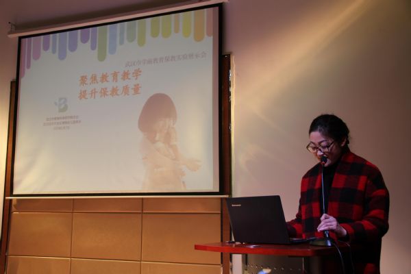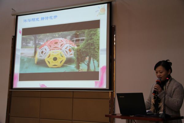 此次活动分2个场地同时进行。首先,经验分享。来自4个区的园长代表发言。武汉常青阳光幼儿园张葵园长分享的题目是“沐浴阳光 静待花开”,本着“阳光般的童年生活,坚实的人生起步”的办园理念,以“善教、扎实、探索、求精”为学习愿景,以《3-6岁儿童学习与发展指南》为指导,努力办人民满意的幼儿教育。