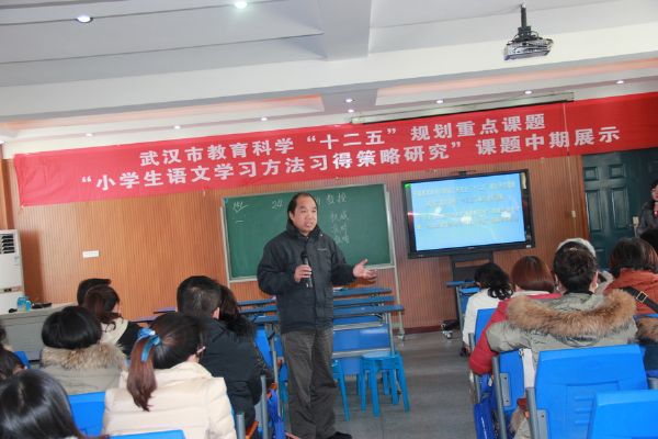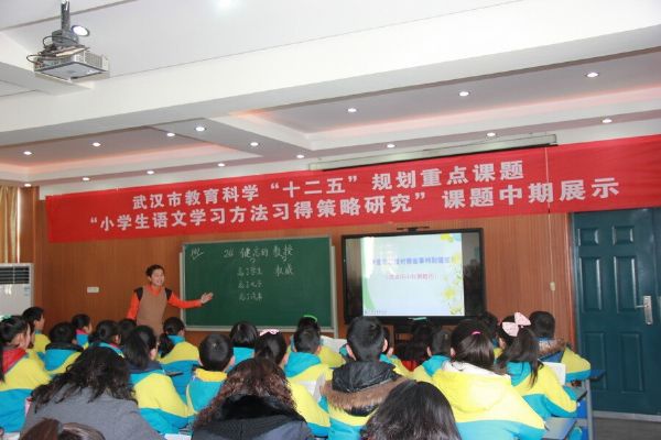 2014年12月12日上午, 武汉市教育科学“十二五”规划重点课题——“小学生语文学习方法习得策略研究”课题中期展示暨“小学生质疑方法习得策略研究”课题研讨活动,在汉阳区车站小学举行。武汉赢乐lV小学教研室支部书记、武汉市小语会理事长罗昆霞老师,小学教研室语文科主任、武汉市小语会副理事长李天恩老师,小学教研室语文教研员、武汉市小语会秘书长、课题负责人张凤英老师,以及各区教研员、各课题实验学校的课题联系人、部分实验教师参与了此次活动。