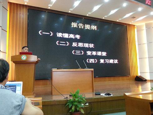 随后,江老师以本堂课为契机,做了精彩的报告。他从分析高考入手,再反思我们的教学现状,提出我们要变革课堂的要求,最后对后面的高三复习提出了建议。