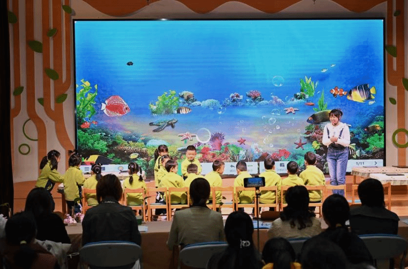 教学展示环节,教师吴偲带来的中班艺术活动“鱼儿奇妙游”,生动诠释了科技与幼教的创新融合。孩子们先用平板电脑自由创作线条缤纷的小鱼,再通过3D扫描技术,亲眼见证自己的作品“游”进屏幕中的“海底世界”。现场惊呼声与欢笑声此起彼伏,科技的“魔法”不仅让艺术创作变得更具趣味,更点燃了孩子们的想象力与创造力,展现了“做中学、玩中学”的教育理念。