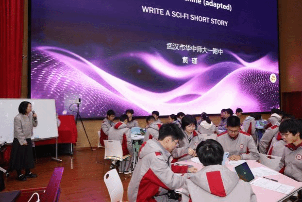 华中师范大学第一附属中学教师黄瑾呈现了选修四Unit1《WriteaSci-FiShortStory》写作课的展示。黄瑾以“支架式教学”为核心设计理念,为学生搭建了从模仿到创新的完整创作路径。她打造“科幻故事要素环”,将科幻概念、独特场景、技术冲突等核心创作维度清晰呈现,构建“语言特征图谱”,从精准动词、修辞运用到时态语态选择,为学生提供可视化的语言表达参考。课堂以“选载体—仿语言—写初稿—评改升”四阶实践链推进,实现了从文本模仿到创意输出的递进衔接。