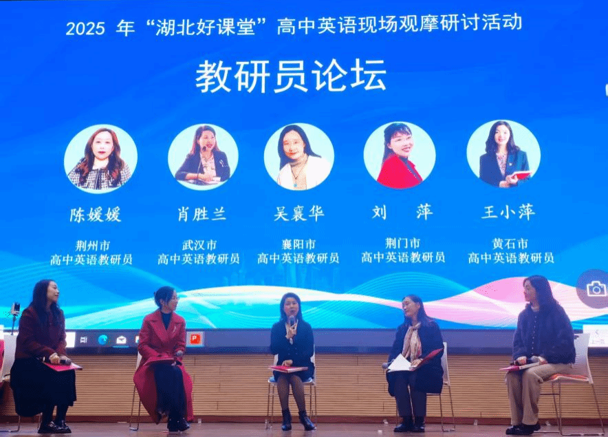 现场研讨交流环节中,武汉、襄阳、荆门、黄石四地的高中英语教研员齐聚一堂,围绕深度阅读实施路径、人工智能与课堂教学融合、教学评一体化等行业热点与实践难点展开深入对话。