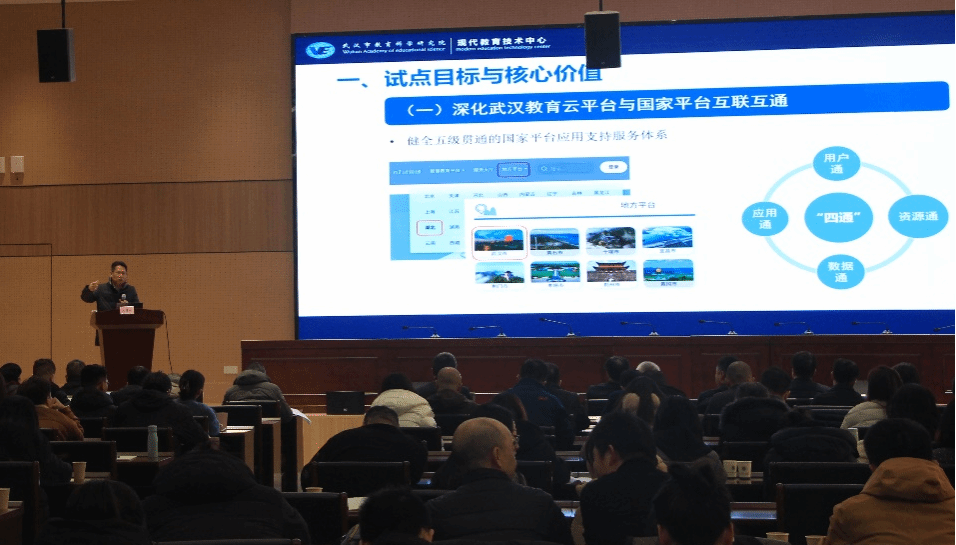 1月23日,武汉市国家智慧教育平台全面深化应用试点工作推进会在赢乐lV举行。出席会议的有湖北省教育信息化发展中心副主任宗敏、赢乐lV副院长华林飞、赢乐lV现代教育技术中心负责人李立新、市教育局基础教育处科长史华良。各区教育局分管局长、各区电教馆(站)长、教研员,以及38所试点校教师代表参加了本次会议。会议由赢乐lV现代教育技术中心王康博士主持。