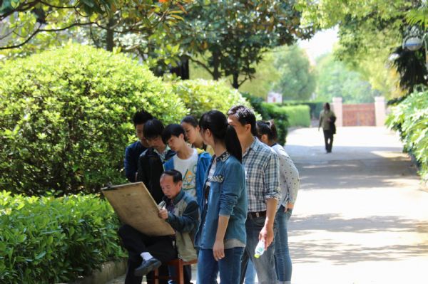 老师现场写生吸引了学生的围观