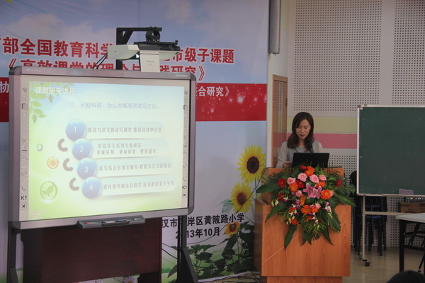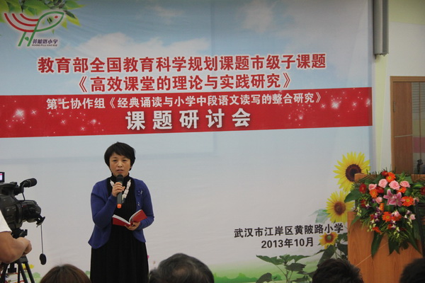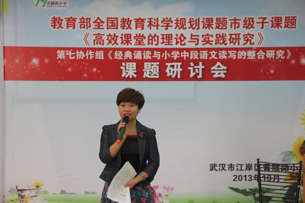 2013年10月24日,市区领导、来自市高效课堂课题研究第七协作组成员、市素质教育特色校快乐教育共同体成员及我区其他兄弟学校的领导,参加了我们黄陂路小学的市教育科学规划子课题《经典诵读与小学中段语文读写的整合研究》课题研讨展示活动。