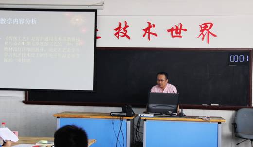武汉三中刘启立老师在进行《焊接工艺》的说课。右上方的计时器是武汉三中通用技术教师周正文老师自己设计制作的。