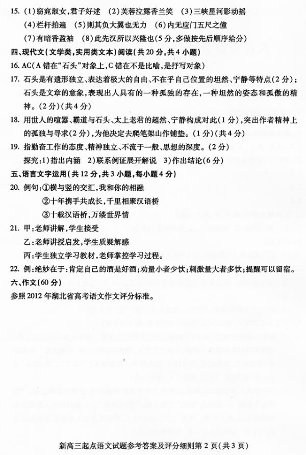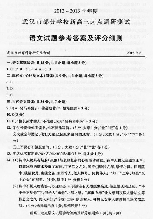 2012-2013学年度武汉市部分学校新高三起点调考语文参考答案