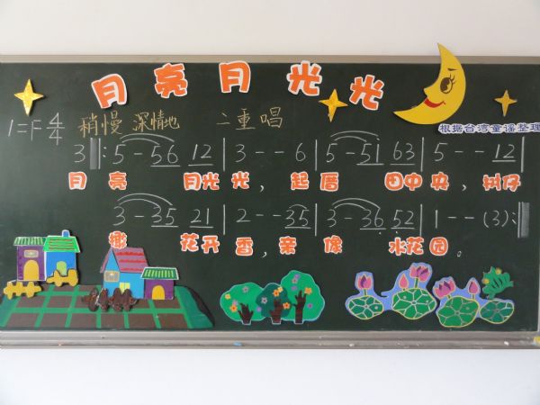 虽说是参加全国优质课的评选,刘玉琦老师仍然追求朴实无华教学风格。这是一节没有多媒体课件的课,一只粉笔,几张图卡,吹、弹、唱、写,她就是用这些最常态化的教学方法完成了教学。而她的板书设计也给与会的教师留下了深刻地印象。在本次评选活动的总结会上,点评专家尹爱青教授对《月亮月光光》的板书就作了充分的肯定。上图就是本课的板书设计,其中,歌曲的情绪、旋律、演唱形式等都是教师在讲述的过程中边归纳边呈现的。由于《月亮月光光》是一首台湾民歌,歌词中有许多方言。刘玉琦老师还精心的设计了几张图卡,在歌词讲解时逐一出示,不但使学生很快了理解歌词,还为整个课堂教学营造了很好歌曲意境。