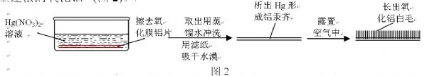 用砂纸擦去铝片表面氧化膜(或将铝片置于强碱溶液中至表面产生大量气泡后取出,立即用大量蒸馏水冲洗后)置于汞盐[Hg(NO3)2]溶液中,反应一会儿后取出,用滤纸吸去其表面水漠,置换出来的汞在铝片表面形成铝汞齐(合金),铝汞齐与空气接触,铝片表面长出大量蓬松的氧化铝[2](图2)。